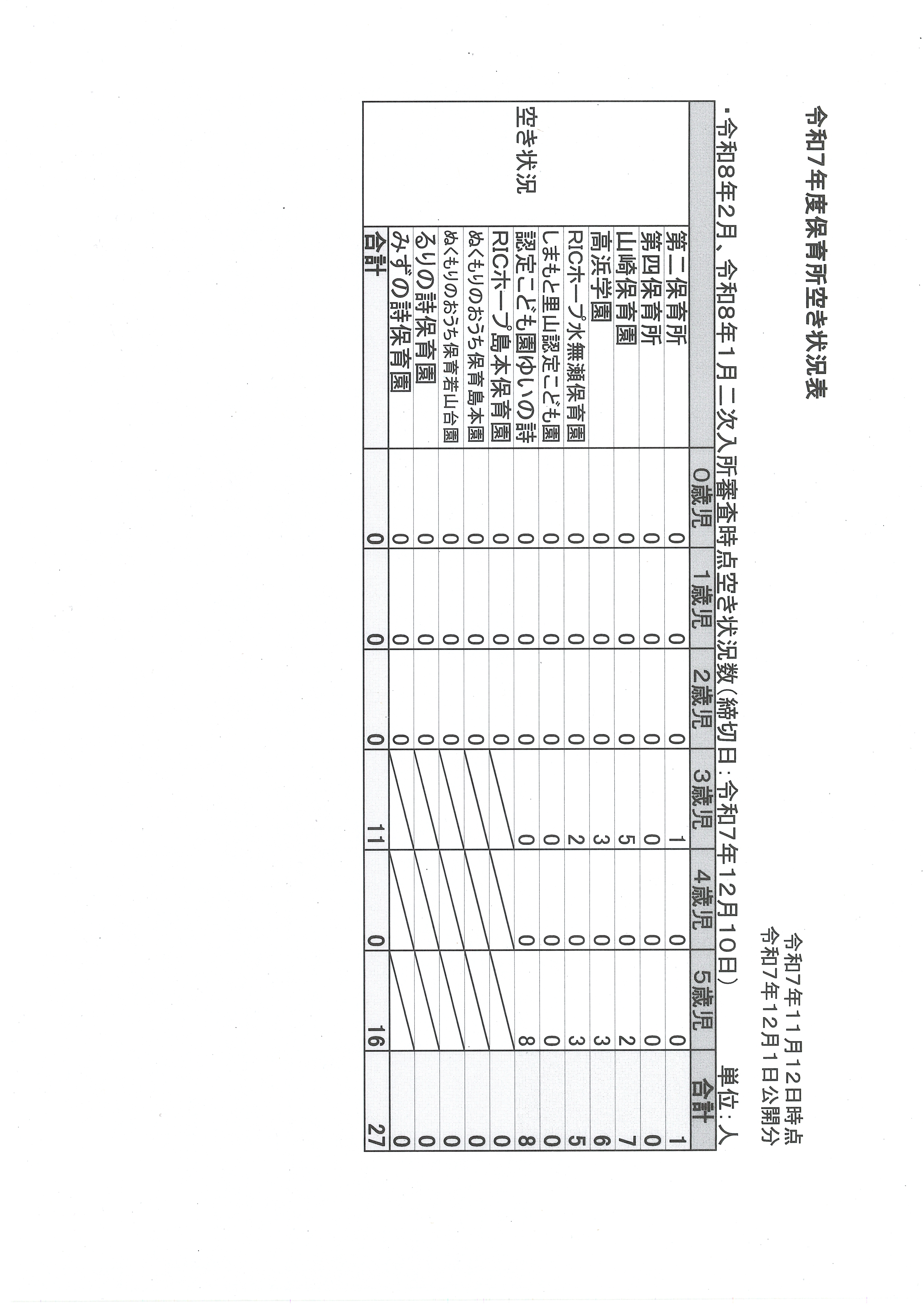 また公表している空き状況は、次回入所審査月に入所可能な空き枠になります。公表時点で入所できるものではありません。